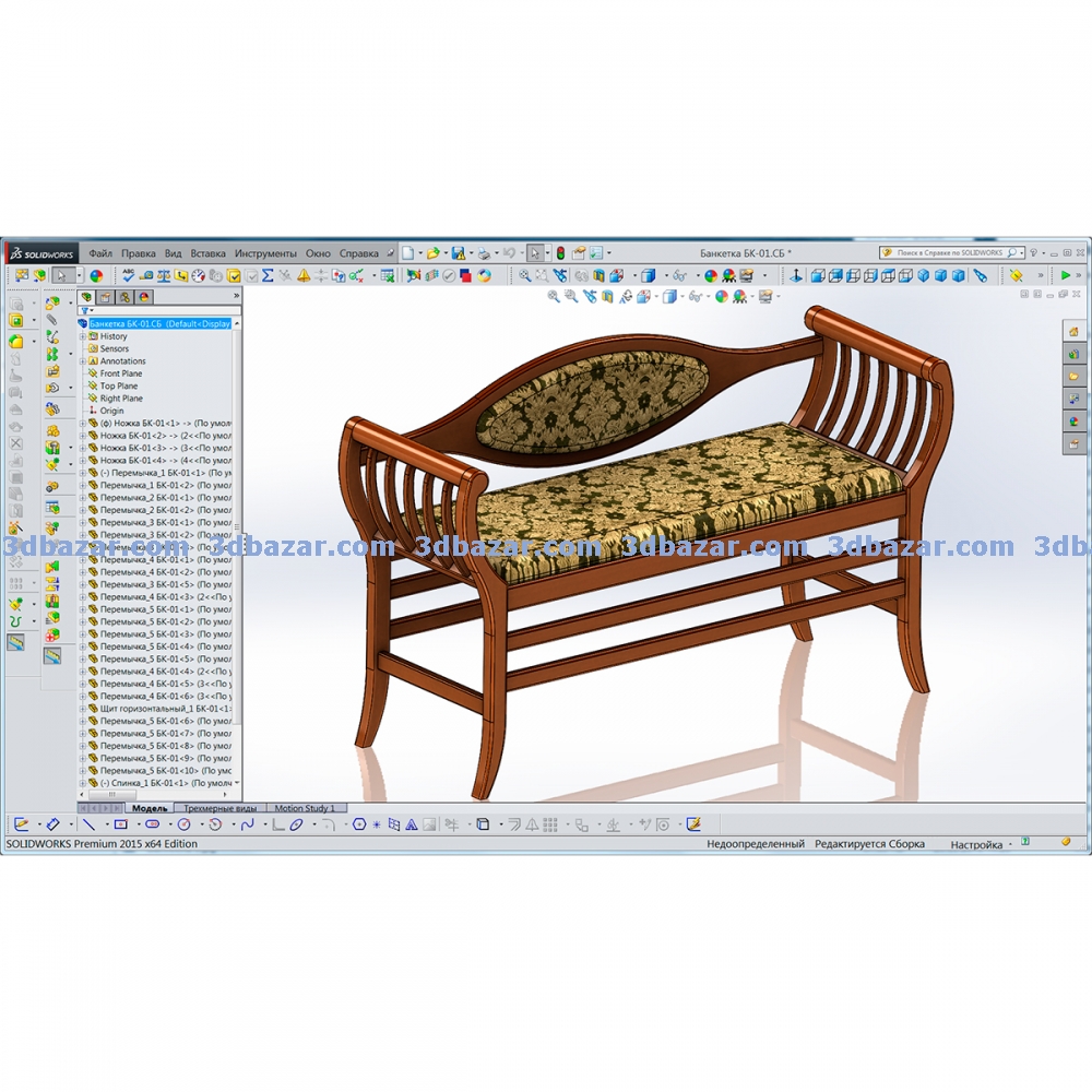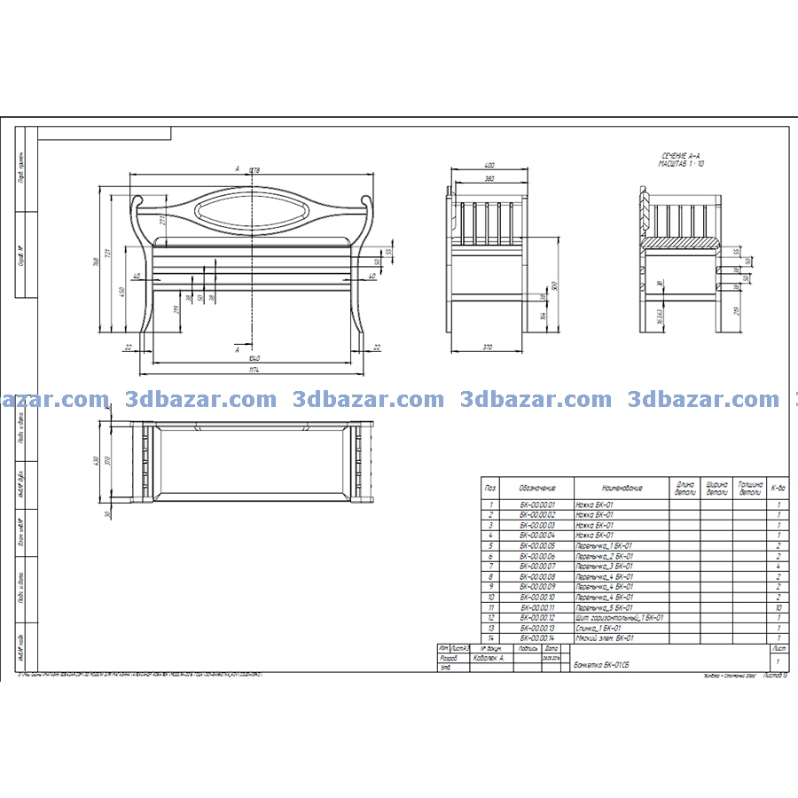 ЗD-модель банкетки с габаритными размерами:1272 х 768 х 430 мм. Имеются подробные чертежи для изготовления.