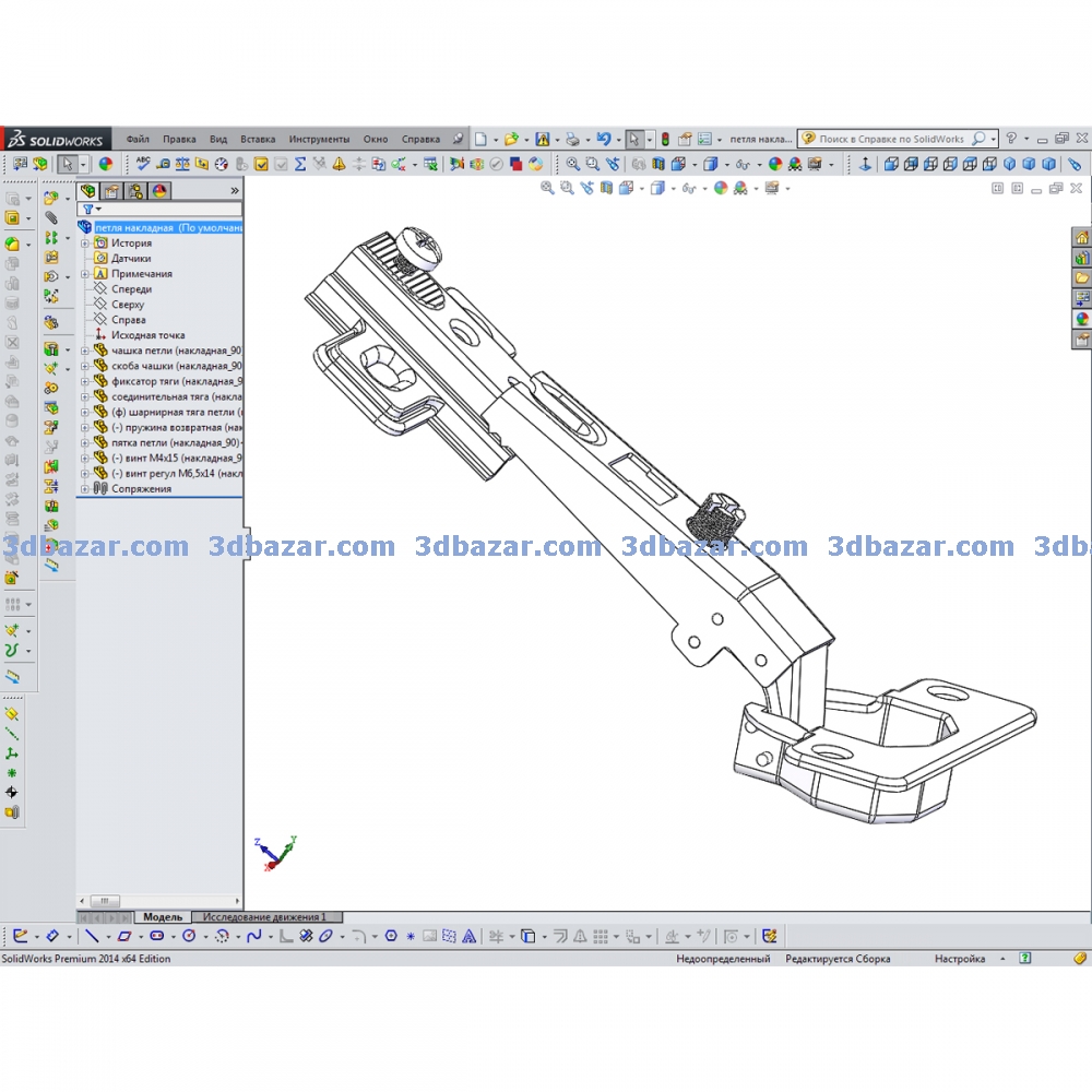 3D модель петли мебельной (тип накладная 90 градусов). Подробно проработанная сборка SolidWorks. Модель петли сохранена в форматах: stl; x_b; IGES (*.igs); STEP AP214 (*.step; *.stp) - для импорта в другие CAD программы. Мебельная петля состоит из самой петли и установочной площадки. Вставляем площадку в петлю, закрепляем винтом – и петля в сборе.